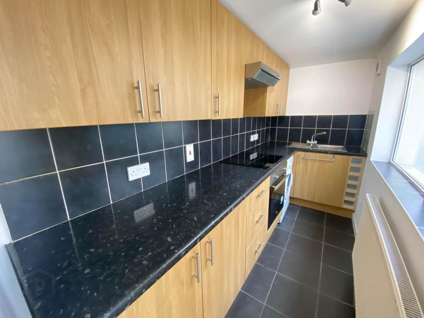 Range of high and low level units in Oak, built in electric hob and oven, extractor fan. Space for washing machine and fridge/freezer. Part tiled walls and flooring.