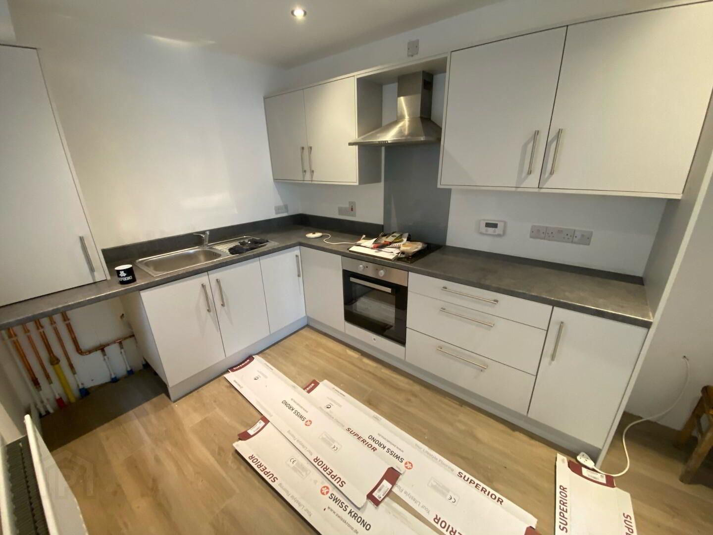 Modern fitted kitchen with range of high and low level units. Built-in oven and ceramic hob.