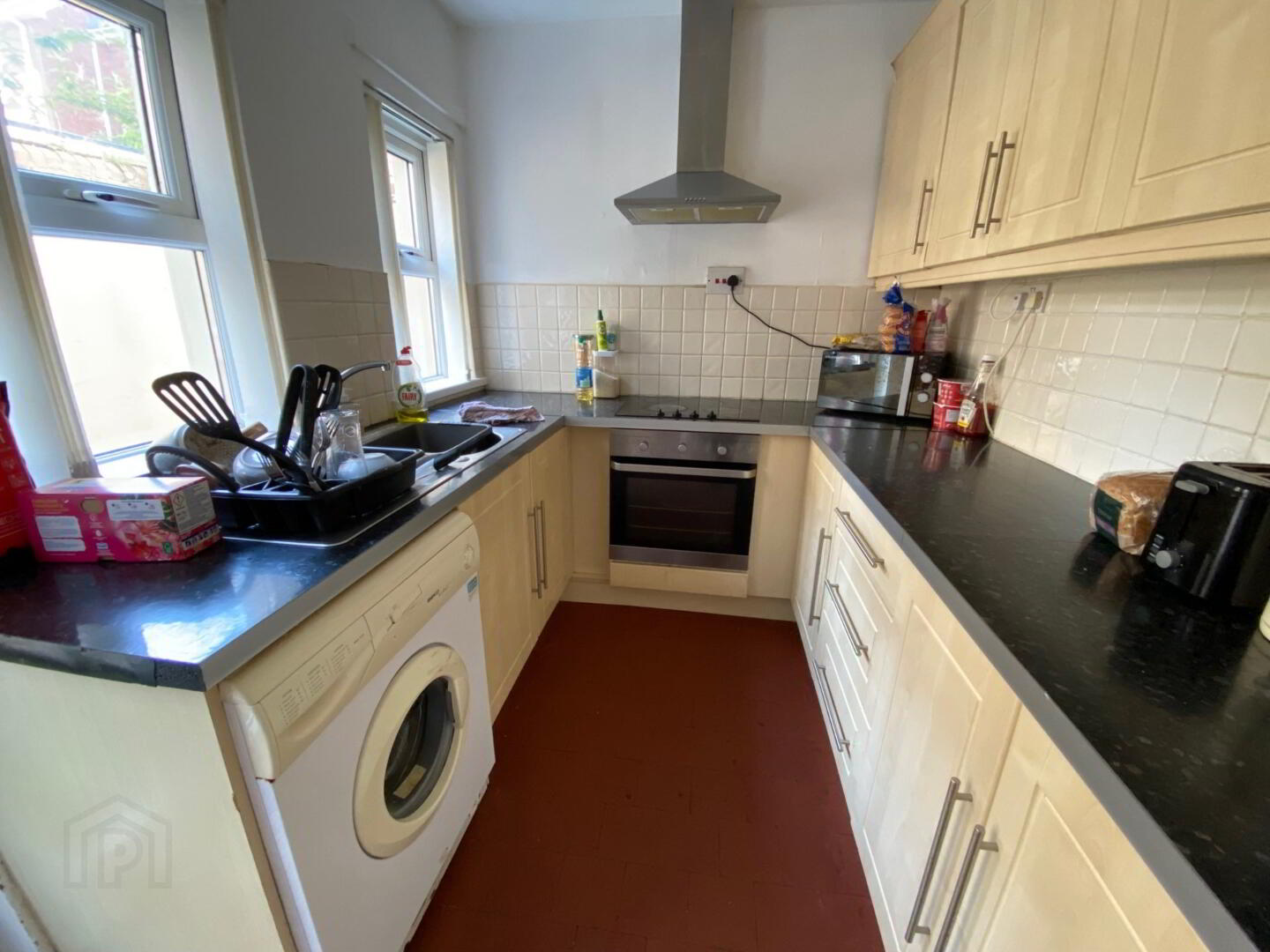 Modern fitted kitchen with appliances, part tiled walls and tiled flooring.