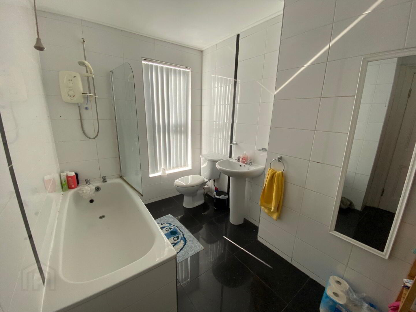 Bathroom (1) Good size bathroom with white bath suite and shower over bath. (2) Separate WC and wash hand basin.