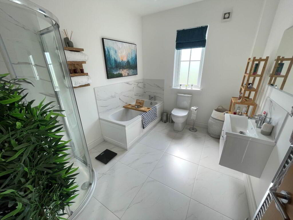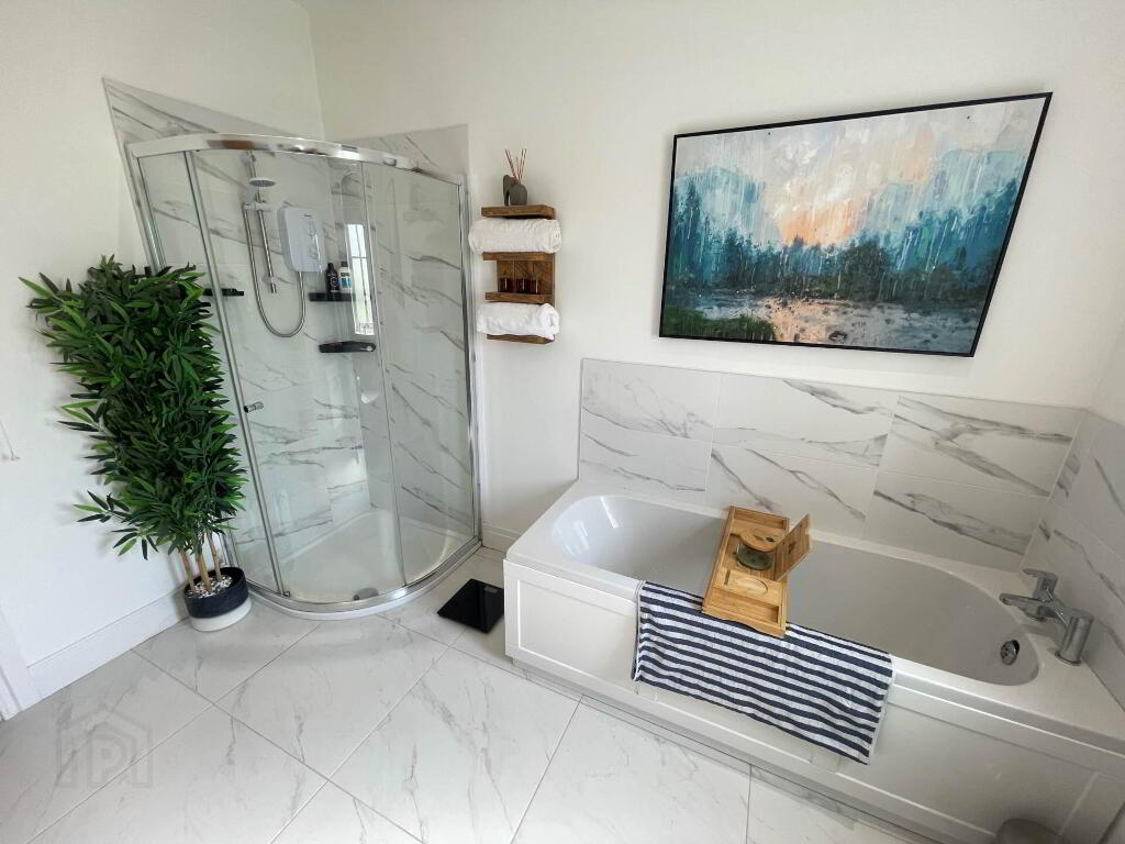 Family Bathroom With White Bath Suite & Separate Shower In Cubicle