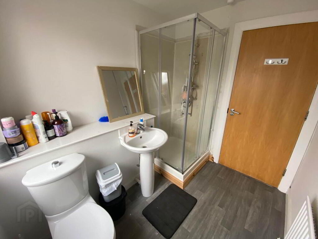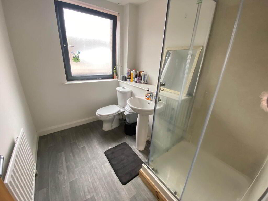 Bathroom - 6'8" (2.03m) x 8'4" (2.54m) White suite to include corner shower, wash hand basin and WC