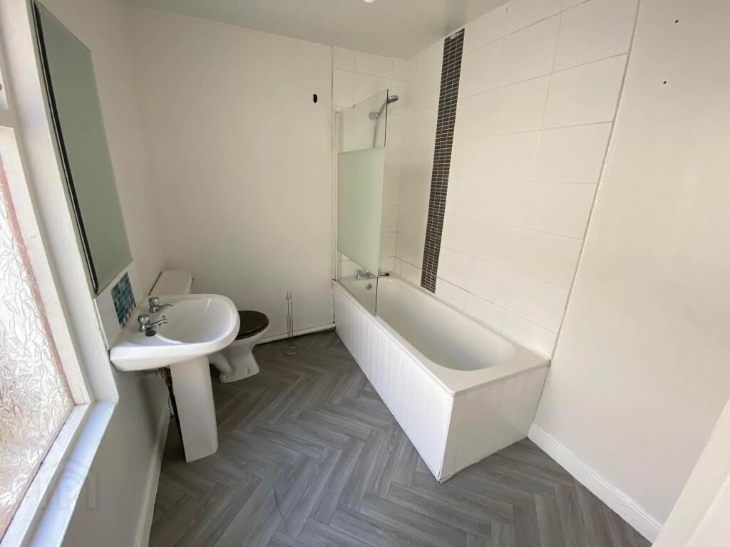 Bathroom - 6'5" (1.96m) x 10'7" (3.23m) White suite include bathroom with shower over. Low flush toilet and wash hand basin. Part tiled walls. Wood effect flooring.