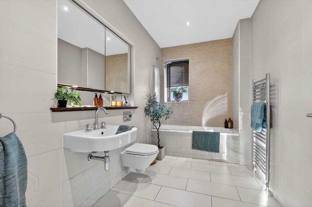BATHROOM - 11'10" (3.61m) x 7'0" (2.13m) Large contemporary bathroom with white bath suite recesses, mirrored bathroom cabinet and fully tiled walls and flooring.