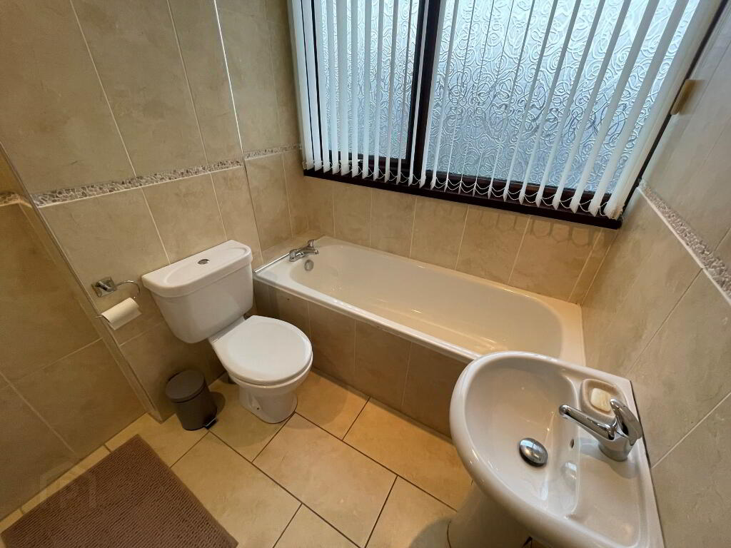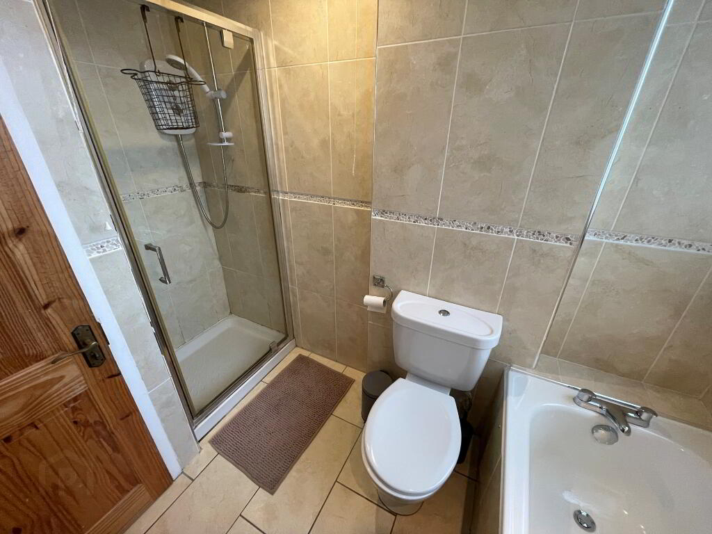Bathroom - Family bathroom with white bath suite and separate shower cubicle with electric shower, fully tiled walls and floors.