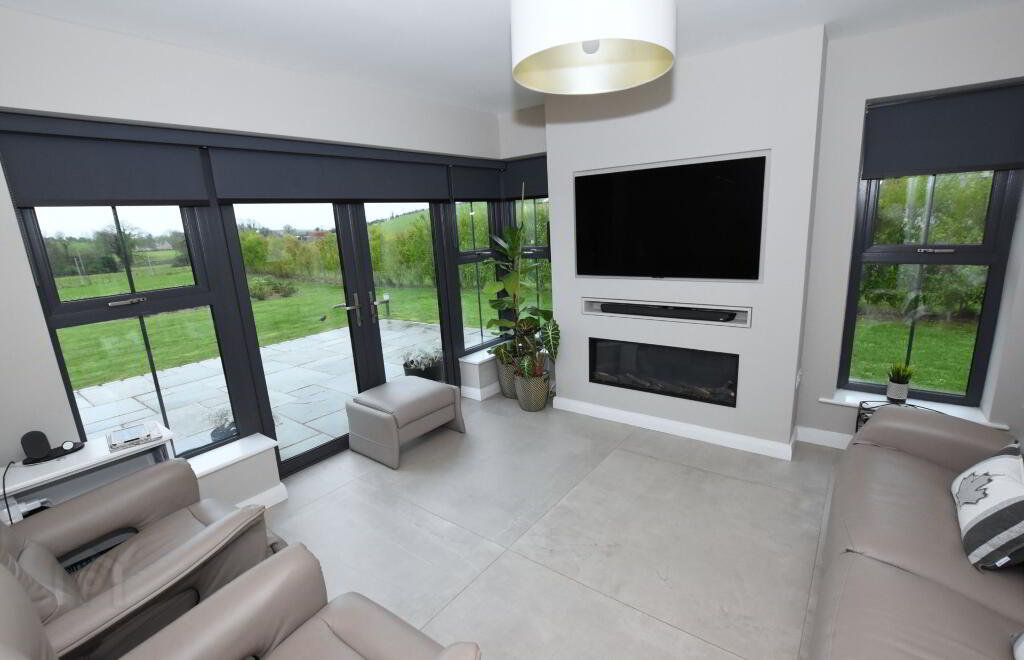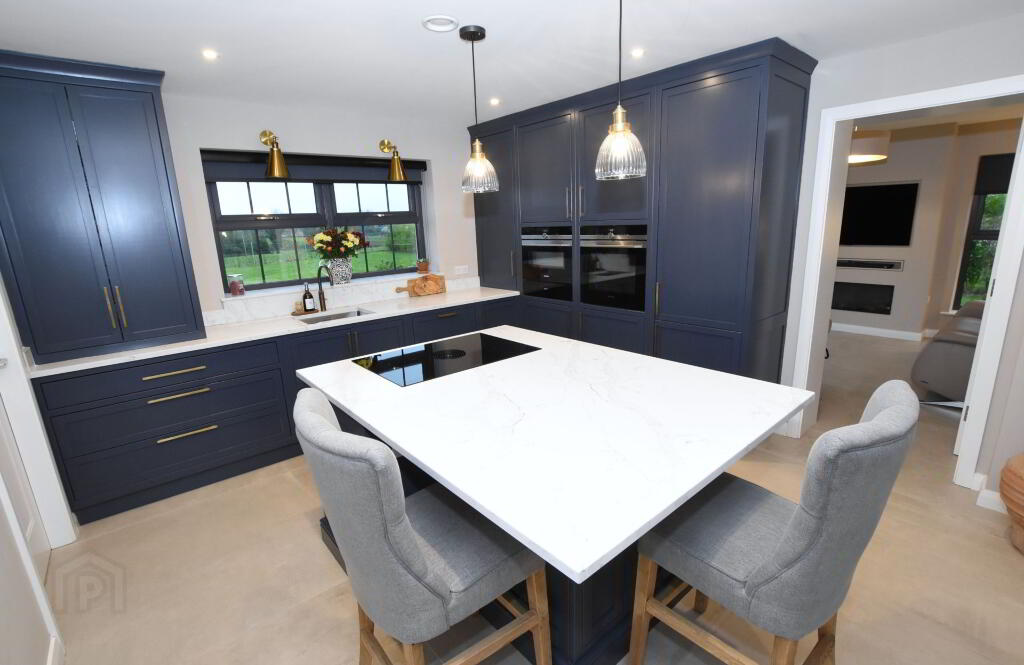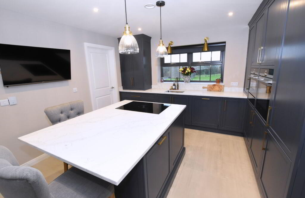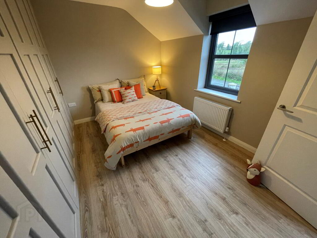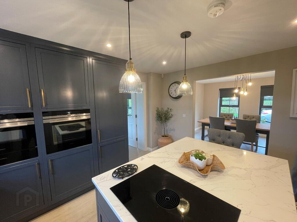Each room is finished to an impeccable standard, featuring windows that highlight the scenic surroundings. The heart of the home is the bespoke kitchen, designed with both aesthetics and functionality in mind. Equipped with integrated appliances, sleek counter tops, and ample storage, this space flows seamlessly into an open plan dining area, making it ideal for family gatherings and hosting.