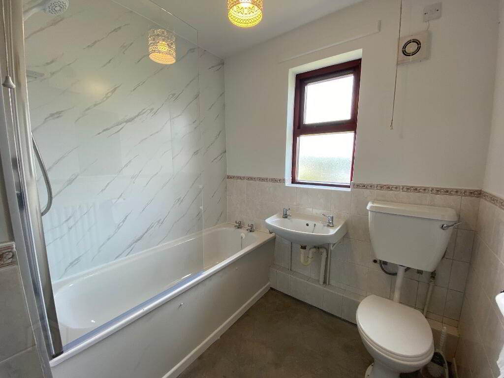 Bathroom with white bath suite and new electric shower over bath. Part tiled walls and part marble effect panelling. New vinyl flooring to be fitted.