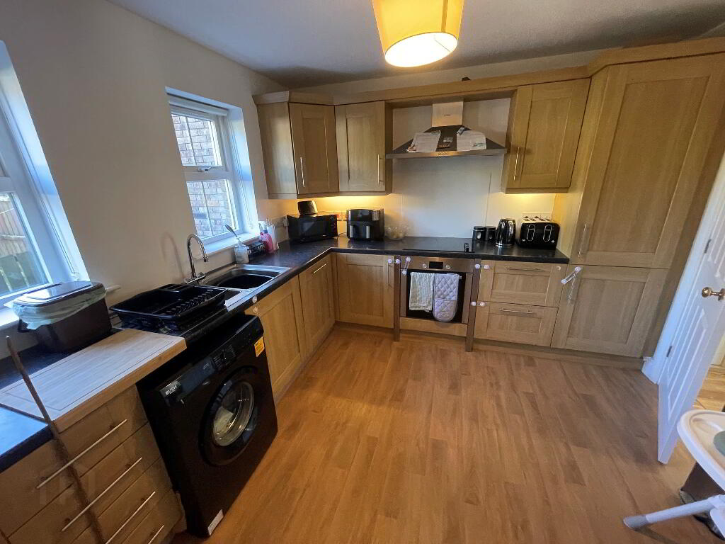 Fitted kitchen with range of high and low level units, single drainer stainless steel sink unit, all in one fridge freezer, plumber for washing machine and dishwasher, cooker space.