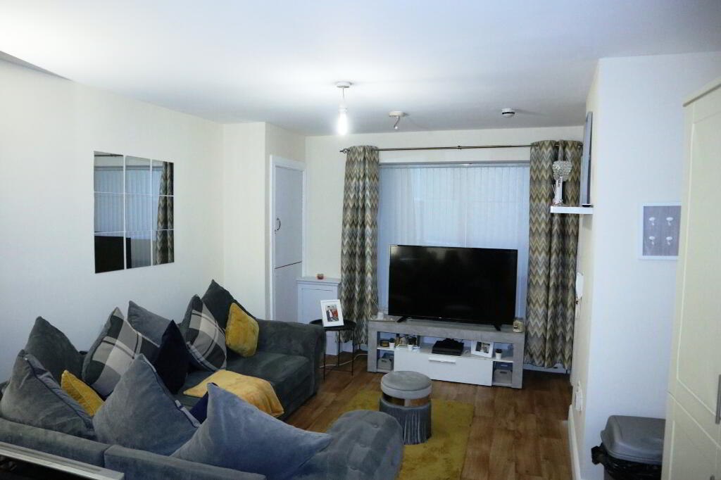 Bright and spacious lounge neutrally decorated and wood effect vinyl flooring.