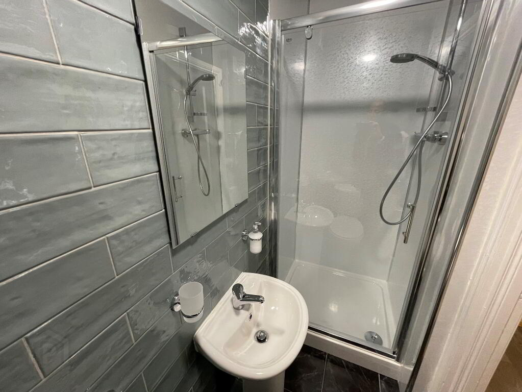 Ensuite with shower in cubicle and white suite, walls tiled with brick style tiles and shower walls with PVC cladding, tiled flooring.