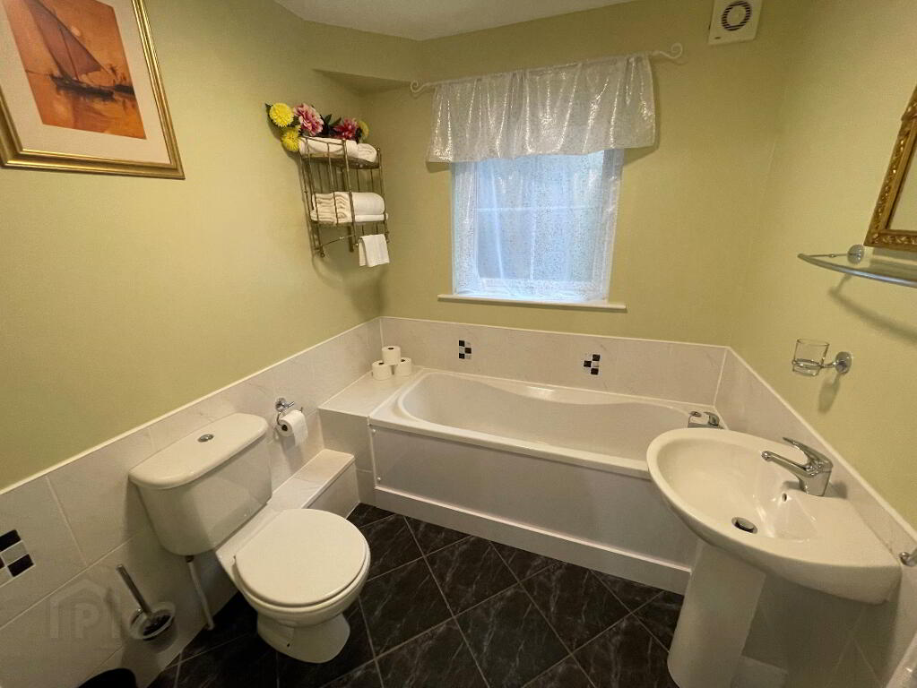 Main bathroom with white bath suite, part tiled walls and tiled flooring.