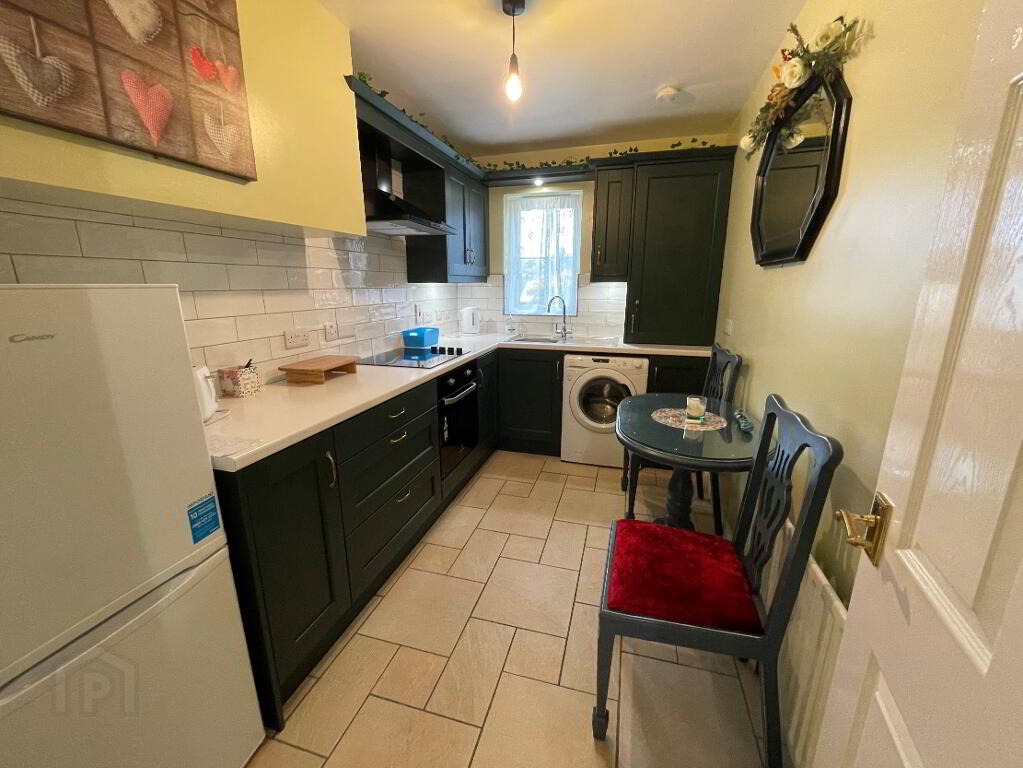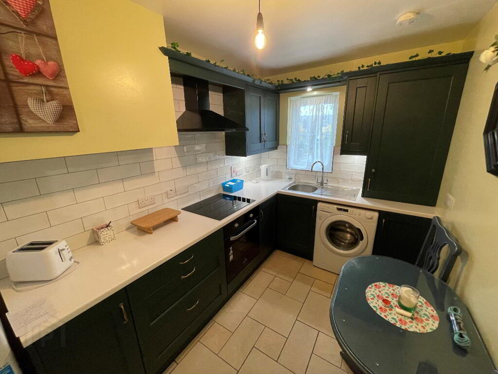 Contemporary fitted kitchen with appliances, part tiled walls and tiled flooring.